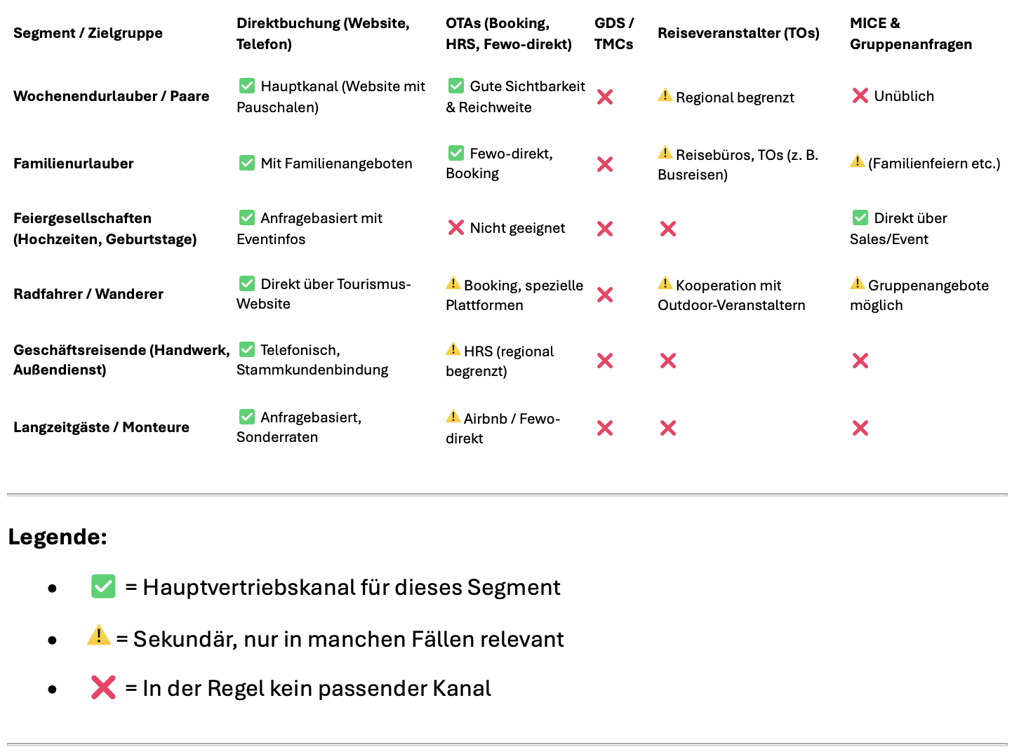 Die Matrix zeigt auch, dass eine Diversifikationsstrategie über alle Kanäle hinweg nicht immer sinnvoll ist – spezialisierte Kanäle wie Reiseveranstalter sind nur für spezifische Segmente relevant und würden bei anderen Zielgruppen zu ineffizienten Kostenstrukturen führen.